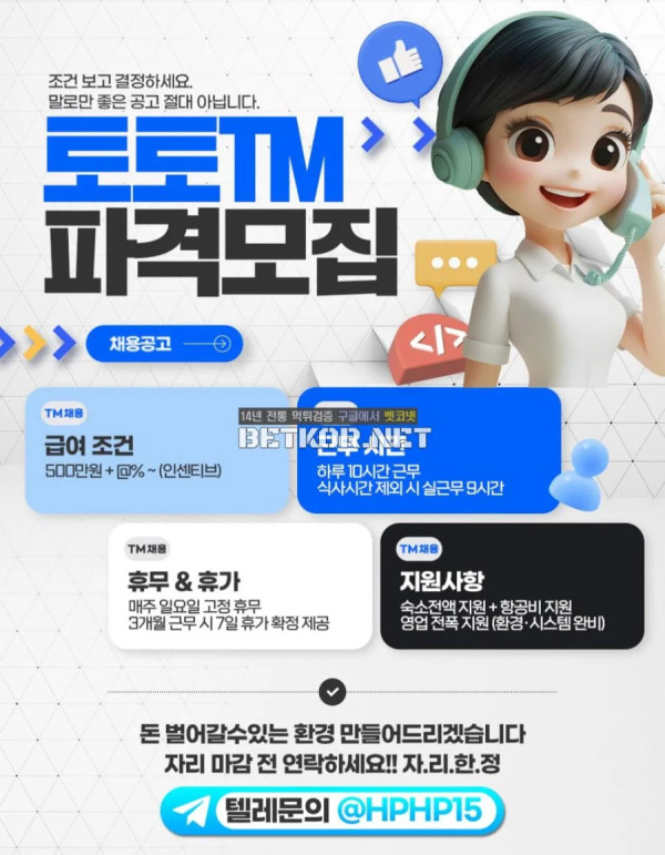분류 업체홍보 해외 (( TM )) 구인모집!! 작성자 정보 작성자 돈좀벌자 작성일 2026.02.05 14:19 컨텐츠 정보 조회 793 목록 목록 본문 TM 파격 모집 / 자리 한정 조건 보고 결정하세요. 말로만 좋은 공고 아닙니다.급여조건500만원 + @% ~ (인센티브)근무 시간하루 10시간 근무식사시간 제외 시 실근무 9시간휴무 & 휴가매주 일요일 고정 휴무3개월 근무 시 7일 휴가 확정 제공지원사항숙소전액 지원항공비 지원영업 전폭 지원 (환경·시스템 완비)돈 벌어갈수있는 환경 만들어드리겠습니다자리 마감 전 연락하세요담당자 문의 = @HPHP15 관련자료 이전 해외 (( TM )) 구인모집!!! 작성일 2026.02.05 19:55 다음 해외 (( TM )) 구인모집!! 작성일 2026.02.05 14:19 댓글 0개 등록된 댓글이 없습니다. 로그인한 회원만 댓글 등록이 가능합니다. 목록 목록